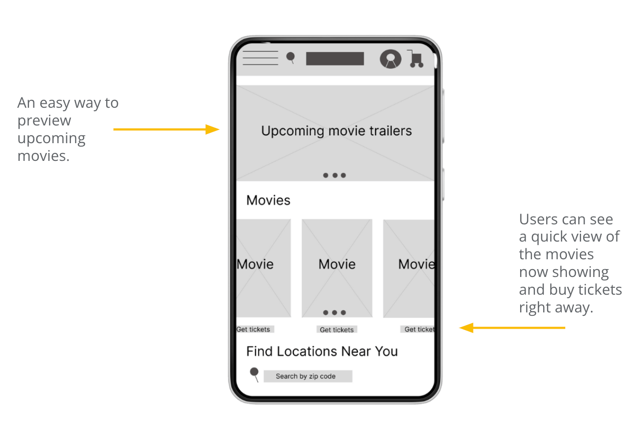 Drawing from this profound understanding, my aspiration materialized as an innovative app that transcends the conventional. It encompasses an array of features including movie reviews, enticing previews, release schedules, seamless integration with work calendars, the provision for guest accounts, and an assortment of payment options to cater to diverse preferences. Furthermore, I sought to address other dimensions of improvement such as facilitating advanced food ordering choices and enabling seat selection, all aimed at elevating the user experience and refining the entire cinematic journey.