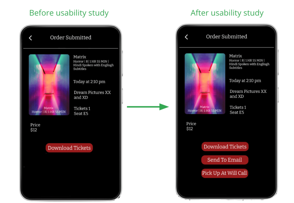 The findings from the usability study underscored the significance of offering users diverse avenues for redeeming their movie theater tickets. In response, I diligently crafted a range of alternatives to cater to their preferences. These options encompassed downloading tickets to their digital wallets, selecting the convenient will call pickup option, or having tickets conveniently sent directly to their email addresses.