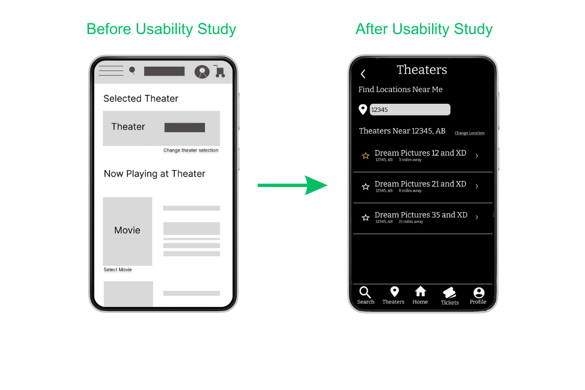 Following rigorous user testing, I embarked on a meticulous design revision journey. This revamp aimed to enhance user experience by seamlessly guiding them towards their nearest theater through a feature that displays the distance from their current location. Furthermore, I introduced supplementary functionalities, including a ‘favorites’ option to enable users to conveniently save their preferred theater. To expedite navigation, a more intuitive bottom navigation menu was seamlessly incorporated, ensuring users could effortlessly navigate through the app with heightened efficiency.